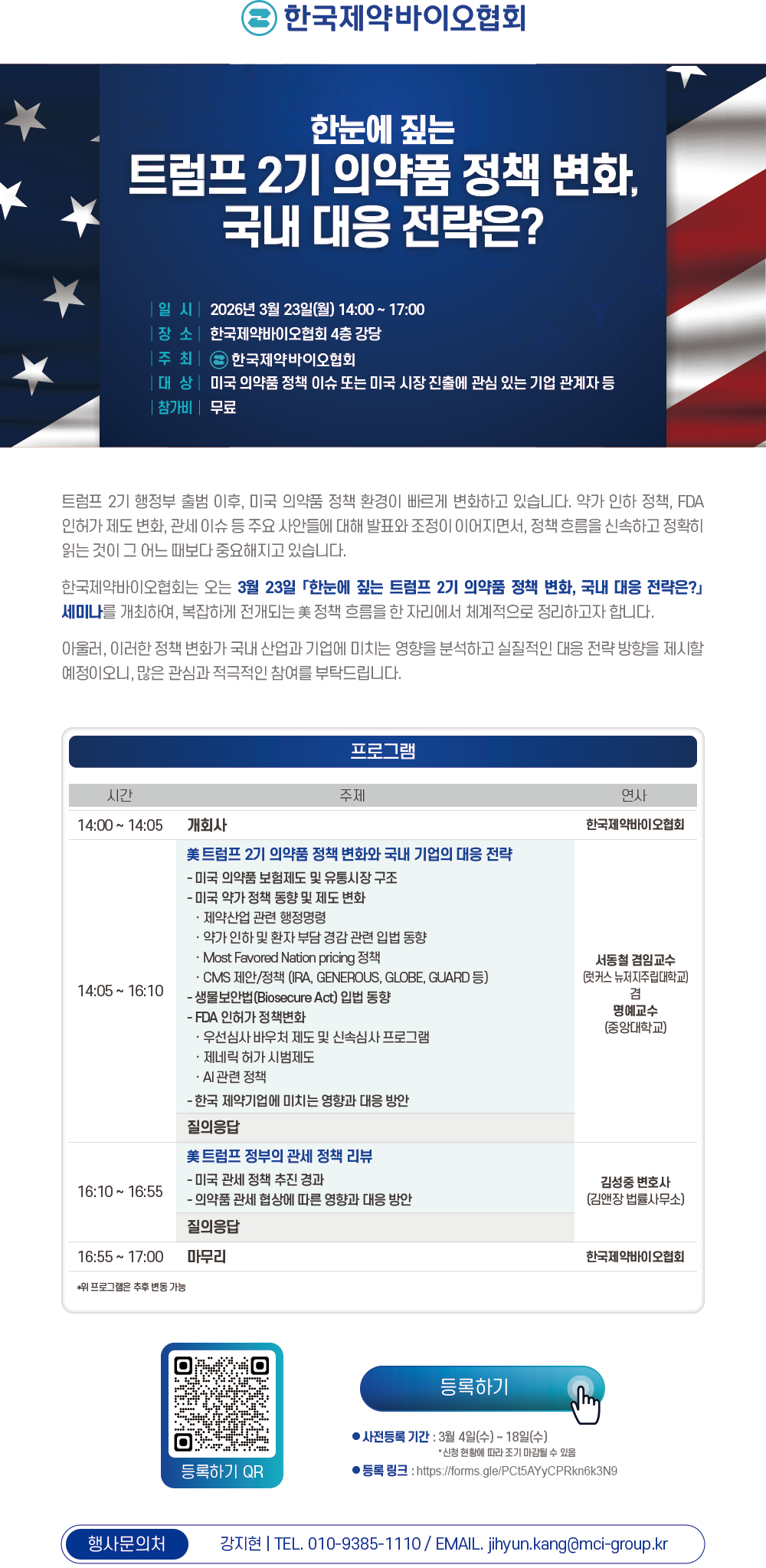 한국제약바이오협회는 트럼프 2기 행정부 출범 이후 빠르게 변화되어 온 미국 의약품 정책 동향을 체계적으로 정리하고, 국내 산업 및 기업에 미치는 영향을 분석하여 실질적인 대응 방향을 공유하고자, 오는 3월 23일(월) 14시, 협회 강당에서 「한눈에 짚는 트럼프 2기 의약품 정책 변화, 국내 대응 전략은?」 세미나를 개최하오니, 많은 관심과 적극적인 참여를 부탁드립니다.