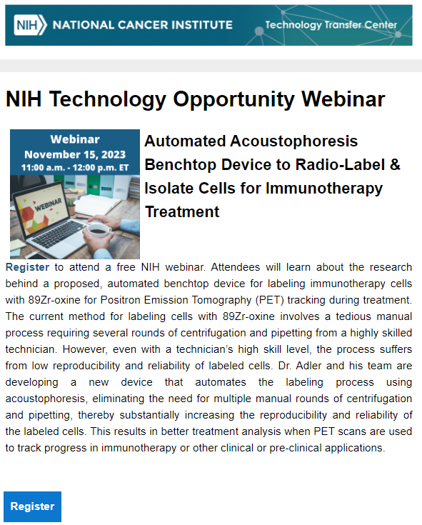The NCI Technology Transfer Center has an upcoming NIH technology opportunity webinar about an “Automated Acoustophoresis Benchtop Device to Radio-Label & Isolate Cells for Immunotherapy Treatment” scheduled for 11/15/2023 at 11am EST. Here's the promotion flyer for this event which includes the registration link for attendees.